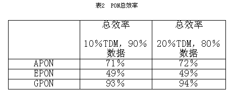 以太网效率因素是根据所收集的数据,按如下分组长短分布来计算的:56.3% 64 byte分组、28.1% 512 byte分组、15.6% 1518 byte分组)。令人惊讶的是,比较显示EPON是效率最低的协议,即使单单处理以太网业务时也如此。这是由于“EPON税”太高所致。表2列出各种不同协议PON的总效率。