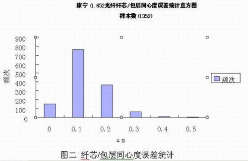 对于原材料之一的紧套光缆及光纤,成都康宁光缆全部采用美国康宁产光纤,依托康宁公司全球领先的光缆制造技术,制造出国内领先水平的紧套光缆,并用之于本公司的连接器跳线的生产,确保光纤光缆原材料的品质。图二和图三即是本公司采用的康宁公司G652光纤的主要特性参数,其纤芯/包层同心度误差和衰减系数统计值均远好于国内相关行业标准的要求(行业标准的要求分别为≤0.5μm和≤0.5dB/km):