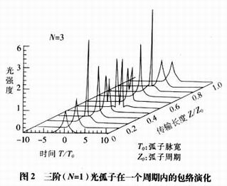 正是基阶孤子这种长距离传播不变形的优异特性,使其成为光通信的理想传输技术;而对于N>1,孤子解的形式将变得相当冗长,出现二阶、三阶等高阶孤子,在传输过程中强度和脉宽也不会像基阶孤子那样稳定不变,而是作周期性变化,即先变窄,而后分裂为个几窄脉冲,最后在ξ=π/2处恢复原形,如图图2所示。
