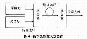 而分布式EDFA是使用低浓度的掺饵光纤作为传输介质的,即利用掺饵光纤产生的受激放大增益来补偿光纤的损耗,放大器的装置如图4所示。