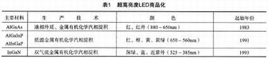 自上世纪九十年代以来,LED芯片及材料制作技术的研发取得多项突破,透明衬底梯形结构、纹理表面结构、芯片倒装结构,商品化的超高亮度(1cd以上)红、橙、黄、绿、蓝的LED产品相继问市,如表1所示,2000年开始在低、中光通量的特殊照明中获得应用。LED的上、中游产业受到前所未有的重视,进一步推动下游的封装技术及产业发展,采用不同封装结构形式与尺寸,不同发光颜色的管芯及其双色、或三色组合方式,可生产出多种系列,品种、规格的产品。