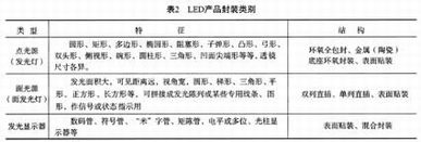 LED产品封装结构的类型如表2所示,也有根据发光颜色、芯片材料、发光亮度、尺寸大小等情况特征来分类的。单个管芯一般构成点光源,多个管芯组装一般可构成面光源和线光源,作信息、状态指示及显示用,发光显示器也是用多个管芯,通过管芯的适当连接(包括串联和并联)与合适的光学结构组合而成的,构成发光显示器的发光段和发光点。表面贴装LED可逐渐替代引脚式LED,应用设计更灵活,已在LED显示市场中占有一定的份额,有加速发展趋势。固体照明光源有部分产品上市,成为今后LED的中、长期发展方向。