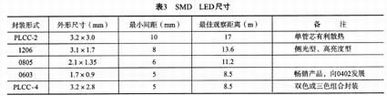 表3示出常见的SMD LED的几种尺寸,以及根据尺寸(加上必要的间隙)计算出来的最佳观视距离。焊盘是其散热的重要渠道,厂商提供的SMD LED的数据都是以4.0×4.0mm的焊盘为基础的,采用回流焊可设计成焊盘与引脚相等。超高亮度LED产品可采用PLCC(塑封带引线片式载体)-2封装,外形尺寸为3.0×2.8mm,通过独特方法装配高亮度管芯,产品热阻为400K/W,可按CECC方式焊接,其发光强度在50mA驱动电流下达1250mcd。七段式的一位、两位、三位和四位数码SMD LED显示器件的字符高度为5.08-12.7mm,显示尺寸选择范围宽。PLCC封装避免了引脚七段数码显示器所需的手工插入与引脚对齐工序,符合自动拾取—贴装设备的生产要求,应用设计空间灵活,显示鲜艳清晰。多色PLCC封装带有一个外部反射器,可简便地与发光管或光导相结合,用反射型替代目前的透射型光学设计,为大范围区域提供统一的照明,研发在3.5V、1A驱动条件下工作的功率型SMD LED封装。