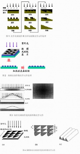 微光学元件的制作方法归纳起来有两种:机械加工方法和光学加工方法。机械加工方法主要有[1]:光纤拉制(Drawing of Fiber Lenses)、超精度研磨(Ultraprecision Grinding)、注模(Moulding)、金刚石车削(Diamond Turning)等。光学加工方法就是光刻(Photolithography)。机械加工方法的优点是工艺过程简单,缺点是难于实现阵列型器件和大规模廉价复制,而且不易制作非旋转对称微光学元件,如柱面透镜、任意不规则面型微光学。光学加工方法的优点是:能实现任意不规则面型透镜(尤其是二元微光学元件更是如此),可以大规模复制、缺点是工艺复杂、对环境要求较高。光学光刻可实现二元衍射微光学元件和连续面形微光学元件,主要有二元光学方法、掩模移动法、灰阶掩模法、热熔法和梯度折射率方法等。图1 是采用光刻方法加工8台阶二元衍射微光学元件的加工工艺原理,采用三块不同频率的掩模,通过三次甩胶、曝光、显影、刻蚀等工艺实现95%衍射效率的微光学元件。图2 是采用掩模移动法制作连续面形微光学阵列元件,首先根据要求的面形设计掩模,然后在曝光过程中通过移动掩模,实现各部分的不同曝光量,最后通过显影、反应离子刻蚀,将光刻胶的面形传递到光学表面材料上。灰阶掩模法是根据微光学元件所需面型,对掩模进行灰阶编码,形成相应的光强透过率分布函数,通过一次曝光、显影,即可得到相应的光刻胶面形,最后通过刻蚀,得到光学材料上的面形,如图3 所示。热熔法是通过曝光后光刻胶的表面张力作用的收缩,形成面形,如图4 所示。这几种方法中,热熔法由于面形不容易控制和难于制作不规则面形而应用领域受到限制,二元衍射方法虽然能实现各种复杂面形而得到广泛应用,但受到光刻线宽分辨率的限制而不能制作较大数值的微光学元件;掩模移动法能制作较大数值孔径元件但难于制作不具有中心对称或旋转对称元件。灰阶掩模法具有设计灵活、能制作任意面形的微光学元件,但是掩模制作过程中数据量较大,难于精确地控制面形。总的说来,二元衍射方法适合于小数值孔径微光学元件而连续面形方法适合于制作大数值、小口径微光学元件。