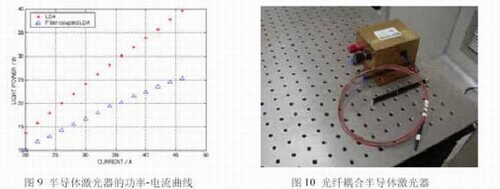 采用微透镜阵列对40W条阵半导体激光器进行光纤耦合,该激光器由19 个发光区构成,每一个发光区长度为150µm,发光区间距为500µm,因此条阵发光区长度为10mm,在快、慢轴方向的发散角分别为8°和36°(FWHM)。通过快慢轴微透镜阵列准直后,其快慢轴方向的准直光束的发散角为2.3mrad 和42.5mrad,光斑约为10mm×0.6mm,经过两次折叠,变成1.2mm×5mm 光斑。采用焦距f=15mm,口径D=6.35mm 的聚焦透镜耦合进入光纤,耦合进入芯径为800um,数值孔径为0.22NA 的多模光纤,其耦合效率达到了63.8%。图9 为条阵半导体激光器的P-I 曲线和光纤耦合输出的P-I 曲线,图10 为实际的光纤耦合半导体激光器。功率损耗主要在以下几个方面:实测效率低首先是准直包络能量快、慢轴方向仅有90%;其次各个透镜反射能量的损耗约占5~8%;整形过程中对波面的分割和重新排列时的边缘损耗约5~8%;最后是耦合光纤端面的反射和端面的泄露损耗了约10%能量。