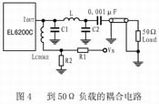 EL6200C可与电抗负载相接,可用作小范围调制发送器。其输出电路看起来像电流源。维持正确的直流偏置电压对EL6200C来说是很重要的。由于输出是纯直流电流,电容耦合将允许直流电平向电源尾部漂移,这将引起输出变形。图4所示为EL6200C输出到50Ω负载的耦合电路。图中,L=124nH,X1=6.4pF,C2=3.5pF。