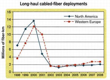 图一:长途光纤光缆在北美与西欧于一九九八~二○○○年间戏剧性的大量快速配置,伴随着成长曲线之后是迅速的下滑。