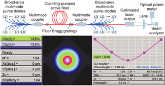 耦合多个100瓦级光纤激光器的输出功率可以很好地提升光纤激光器的输出功率到一个更高的级别。比如说,7个100瓦级光纤激光器输出的光束通过7个单模光纤传送30米以上的距离,然后在一条多芯光纤波束耦合器中被合成,输出一个直径80 μm,发散角小于40 mrad的波束。这相当于一个输出光束参数<1.6 mm mrad 的激光;700瓦的耦合输出功率可以以一束强烈的激光作用在工件上,每平方厘米可达高于50千瓦的功率。比较而言,一个二极管泵浦固态激光器典型的光束参数>10mm mrad,输出功率密度也只有光纤激光器的50分之一。700瓦级的光纤激光器大小为55 × 60 × 95 cm3 ,重量为120千克。
