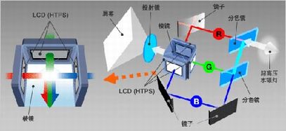 (限于固定像素方式,CRT方式除外) (1) 3LCD方式 这是目前在全球范围内使用最广泛的方式。采用LCD(HTPS)作为光阀。从光源射出的光线通过特殊的分色镜分离成红、绿、蓝三原色,然后采用各色专用的LCD绘制图像,经合成后投影。 (2) DLPTM*1方式 显示元件采用DMDTM*2(Digital Micromirror Device)。 DMD是一种由数十万~百数十万个微米级的微小型反射镜组成的半导体,每一个反射镜对应一个像素,通过反射来自光源的光线来投影图像。有单片、3片式。 (3) LCOS方式 显示元件采用LCOS(Liquid Crystal On Silicon)。LCOS是一种反射型的液晶显示面板,特点是开口率高。配线部分和开关元件设在反射层的下面,因此不需要黑色矩阵部分,能够实现无缝连接的图像显示。有单片式、3片式。 一、3LEC投影技术分析 采用LCD(HTPS)作为光阀。从光源射出的光线通过一种能够仅让特定的光透过的反射镜(分色镜),分离成红、绿、蓝三原色,然后通过棱镜将经过各色专用液晶板控制的光线进行重新合成、投影。 二、DLP投影技术分析 DMDTM在结构上是在半导体基板上铺满反射镜、通过ON/OFF来使这些反射镜倾斜。DLPTM是指使用了DMDTM的光学系统的总称,使色轮旋转显示出与某个瞬间的色彩一致的画像,能通过每秒进行数千次的旋转来显示全彩色。 三、LCOS投影技术分析 显示元件采用反射型液晶元件LCOS(liquid crystal on silicon)。充分利用高分辨率元件的特性,实现了3-chip LCOS方式的高性能投影机、背投电视机。1-chip LCOS方式的情况下,采用通过把光分解成RGB来投影的旋转棱镜机构的光顺序驱动方式。 摘自:中日液晶网 |