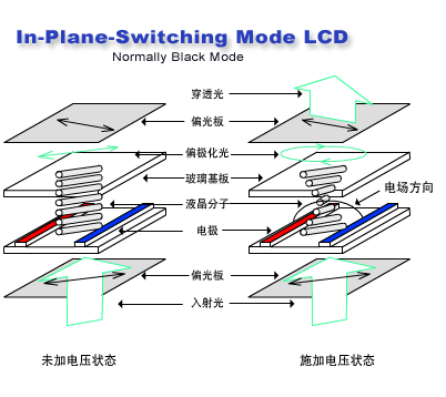 IPS起初是由Hitachi所发展,但现在NEC及Nokia也采用这项技术。IPS与使用TN+Film(扭转向列液晶+视角扩大膜组合)技术不同的地方是液晶分子的对准方向平行于玻璃基版。使用IPS或Super TFT技术可以使视角扩大到170度,就如同CRT监视器的视角一样好。但是这项技术也有缺点,因为液晶的对准方向,使得它的电极只能置于两片玻璃板中的其中一边,而不像TN模式一样。这些电极必须制作成像梳子装状的排列在下层的表面。但是这样做会导致对比降低,因此必须加强背光源的亮度。IPS模式的对比及响应时间与传统的TFT-TN 比较起来并无改善。