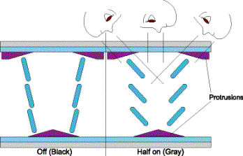 在MVA中,M代表 “multi-domain“(多象限),是就一个子像素(cell)来说。图3说明了以突出物来形成多象限。富士通最近已经开发出四个象限的画素分割技术。VA 代表“Vertical Alignment“(垂直配向),但事实因为有突出物的关系,液晶分子在静态时并不是真的垂直配向(见上图,在off的时候)。当施加电压时,液晶分子变成水平配向因此允许背光通过。对游戏机及动画的应用上,MVA可以提供比TN+视角扩大膜及IPS技术较短的响应时间。在对比方面,也比其它广视角技术高,当然,对比也随视角而变。