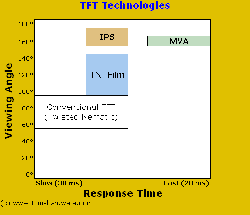 TN+视角扩大膜对响应时间并无太多的改善。之前已提过,这个技术较为便宜并且良率较高,仅能把视角提升到人眼可接受的程度。使用这个技术的显示器将会渐渐没落。IPS已经被多家制造商所采用,包含Hitachi及NEC,都支持这个技术。这个技术成功的因素是因为它提供了170度的视角及可接受的响应速度。从技术的观点来看,MVA是最佳的解决方案。它的视角能高达160度,就如同CRT一样好。它的响应时间也可达20 msec,足够任何画面的播放。应用此技术的的厂商还不多,但在慢慢增加中。
