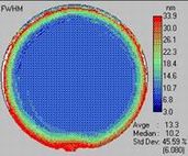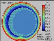 我们进行了三批外延材料的生长分析,三批外延材料采用相同的结构,为了进行外延材料的生长工艺与LED可靠性的关系研究,三批外延材料采用了不同的窗口层生长工艺,外延片编号分别为ACE-1、ACE-2和ACE-3,三批外延材料的GaP厚度一样,ACE-1采用低温生长GaP籽晶层,正常生长速率生长GaP;ACE-2同ACE-1的工艺条件基本相同,只是GaP生长速率加倍;ACE-3则采用优化的GaP生长工艺,该外延片的室温PL光谱为633.5nm,波长的平均半高宽为13.3 nm,典型的PL-Mapping测试曲线如图1。