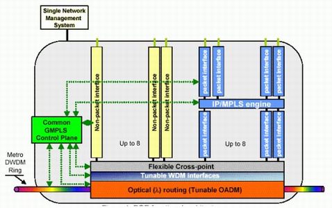 POE节点架构(参看图1)是一个IP/MPLS处理引擎和一个DWDM传输平台在硬件和软件方面的综合集成。硬件集成的效果就是使资本支出大大降低,主要是因为本地光互连的配置和处理,加上机架(chassis),功耗和控制模块的节约才引发出上述效果。而软件的集成则使网络的运营成本大大减少,主要原因是采用了统一的控制面(基于GMPLS技术)和统一的网络管理系统。