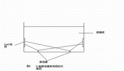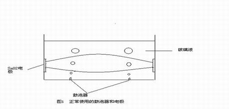 在玻璃的生成阶段为了将原料更好的熔化采取了直接电加热的方式,同时采用鼓泡提高玻璃的熔化程度和均匀性。因此在阶段中玻璃液中有强大的电流,考虑到高温性能一般采用的鼓泡器是Pt制成,当鼓泡器绝缘不理想时,SnO2电极和鼓泡器间会发生电解反应,从而造成Pt的“熔化”。图1表示的是正常的电极工作,图2则是Pt做电极后的示意。