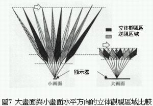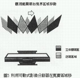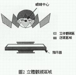 利用这种原理可以针对观视者观赏画面时的最适当位置,除了提供观视者左右两眼影像之外,由影像正面的显示区到最适距离所函盖的区域,对观视者而言就变成正常的立体三次元影像。不过两眼视线相邻处的影像,会被左、右两眼在无意识状态下捕捉读取形成所谓的逆视领域,换句话说使用这种三维立体影像分割器的观视者必需固定在一定的观视位置才能产生立体视觉效果(图2)。