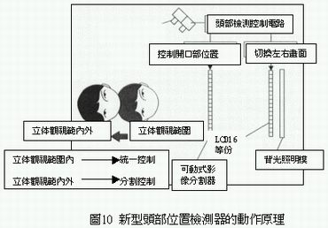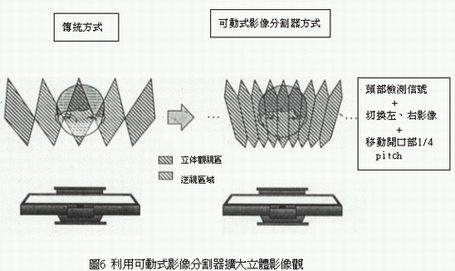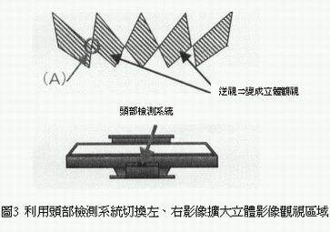 为了改善上述缺失因此开发出头部检测系统(head tracking system),利用这种检测系统可随时侦测观视者头部位置,一旦产生逆视领域时显示器会立即切换左右两眼所读取的影像,如此一来不但可以防止逆视问题的发生,还可以扩大三次元立体影像的可观视范围(图3)。