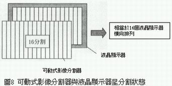 传统的不需专用眼镜的三维立体影像显示器,同样水平方向时小画面的前后方向的立体可视范围比大画面的立体可视范围大(图7),这是因为小画面的视角比较小,液晶显示器与影像分割器较不容易产生所谓的moire干涉缟。利用这种物理现象将液晶显示器与影像分割器,藉由电子方式分割成16等份各别掌控专属区域(图8)