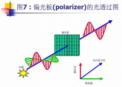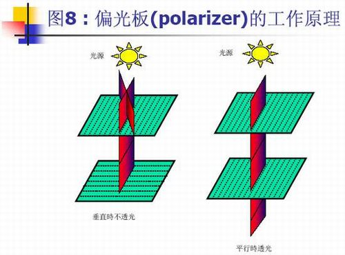 從圖10中我們可以知道, 當上下兩塊玻璃之間沒有施加電壓時, 液晶的排列會依照上下兩塊玻璃的配向膜而定. 對於TN型的液晶來說, 上下的配向膜的角度差恰爲90度.(請見圖9) 所以液晶分子的排列由上而下會自動旋轉90度, 當入射的光線經過上面的偏光板時, 會只剩下單方向極化的光波. 通過液晶分子時, 由於液晶分子總共旋轉了90度, 所以當光波到達下層偏光板時, 光波的極化方向恰好轉了90度. 而下層的偏光板與上層偏光板, 角度也是恰好差異90度.(請見圖9) 所以光線便可以順利的通過, 但是如果我們對上下兩塊玻璃之間施加電壓時, 由於TN型液晶多爲介電係數異方性爲正型的液晶(ε// >ε⊥ ,代表著平行方向的介電係數比垂直方向的介電係數大, 因此當液晶分子受電場影響時, 其排列方向會傾向平行於電場方向.), 所以我們從圖10中便可以看到, 液晶分子的排列都變成站立著的. 此時通過上層偏光板的單方向的極化光波, 經過液晶分子時便不會改變極化方向, 因此就無法通過下層偏光板.