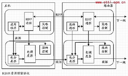 RSVP工作在IPv4或IPv6上,处于开放系统互联(OSI)七层协议中的传送层,但是,RSVP并不处理传送层的数据,从本质上看,RSVP更像是网络控制协议,如因特网控制消息协议(ICMP)、因特网组管理协议(IGMP)或是路由协议。它和路由协议及管理协议的实现相同,RSVP的实现通常在后台执行,而不是出现在数据传送的路径上。在RSVP协议中,QoS的实现是由一组特定的流量控制机制来完成的。这些机制包括包分类器、接纳控制以及包调度器或其他与链路层相关的机制。其中,包分类器决定每个包的QoS的分类,包调度器或其他和链路层相关的机制用来获取所请求的QoS。图1给出了由ISWG(Integrated Services Working Group)所定义的QoS流量控制机制原型。