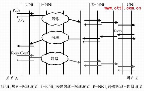 图2显示了利用RSVP-TE实现的交换连接的建立过程。为了建立一个交换连接呼叫连接,用户通过UNI接口使用Path消息发起连接建立请求。此请求通过网络传输到目的用户。如果此请求通过了认证,目的端会使用Resv消息向源端用户发送一个成功指示。另外,作为可选项,源用户还可以再返回一个ResvConf响应。这样就完成了一个完整的连接建立过程。