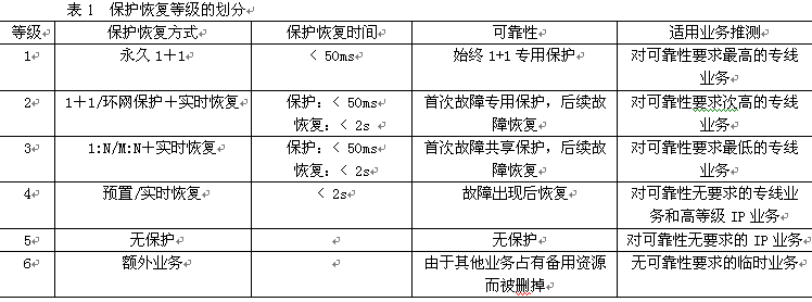由于不同的保护恢复机制出自于不同的设计思路,它们在保护恢复时间和对于业务可靠性的保证程度上存在较大的区别,正是这种区别为划分业务等级提供了一种技术基础,运营商可以根据业务的要求,为不同的业务选用不同的保护恢复等级,并且可以和客户签订基于保护恢复的SLA。表1就显示了针对现有保护恢复机制而进行的等级划分。这里是一个具有普适性的等级划分方式,运营商可以根据具体情况,平衡业务需求和网络资源利用率来选择适当的划分等级。