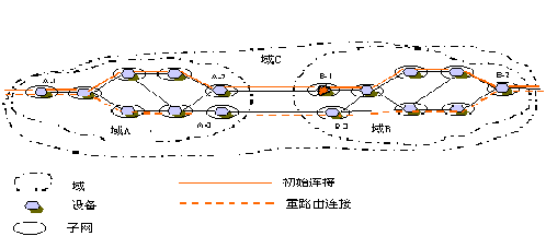 (3)如果域间链路采用了1+1复用段保护来实现域间链路保护,域间恢复机制的启用需要有一个等待延迟时间以防止1+1复用段保护和恢复发生冲突。这个等待延迟时间最多只需设置为50ms。如果采用的是实时恢复,恢复路由的计算可以在等待时间内就进行,在超出等待延迟时间而业务仍未恢复时再开始执行域间恢复操作。