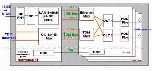 (1) 系统容量:系统具有大容量IP交换内核(30G)提供10G以太网网络接口,每一OLT可以支持36个PON网络。