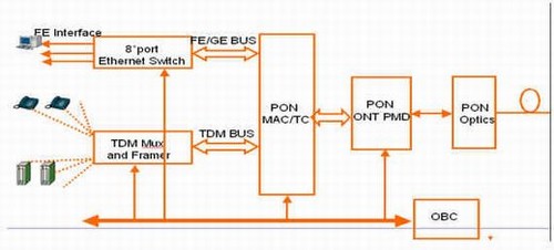 ●测距技术:xPON系统传输的距离可达20公里,ONT之间的距离差最大达20公里,为防止各ONT之间上行信号发送冲突,必须具有精确的测距机构,如何设计并实现具有自主知识产权的测距技术,是xPON技术研究中一个技术难点。