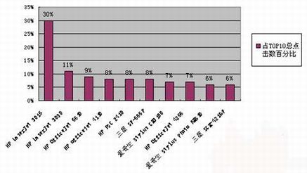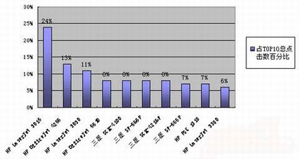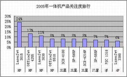 在2005年度多功能一体机产品关注度中,前十名的产品被HP和三星所瓜分。在上榜的产品中,惠普无疑是2005年度的最受关注产品,共有六款产品入围2005年产品关注度前十名。而包揽中游位置的是三星的四款产品。2005年度多功能一体机的产品关注度状元――惠普LaserJet 3015,可以看到惠普LaserJet 3015优势地位丝毫没有减弱。