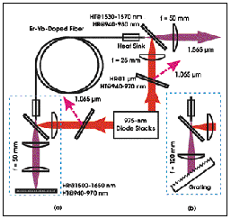 一根3米长的双包层光纤,由一对波长为975nm的二极管激光堆从两端进行泵浦(图1)。这样的光纤长度相对较短,而30μm直径的纤芯则相对较大,这样就能消除有害的非线性效应。 入射到光纤端面的泵浦光,约有80%进入光纤。在光纤端面,有一个V型凹槽铜热沉,可去除没有入射到光纤里面的泵浦光功率,以及由Er-Yb系统内部量子缺陷所产生的热。
