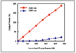 这些应用通常要求较高的功率,但传统的对眼睛安全的激光器,如二极管泵浦Er-Yb-玻璃或晶体激光器,由于高输出功率要求高泵浦光强,这时都会遇到热畸变问题。这种热畸变不仅会减低激光效率和限制输出功率, 而且还会降低输出光束的质量。而且,体材料固体激光器的波长调谐能力也很差,因为它们的带宽 100 W">相对较窄。