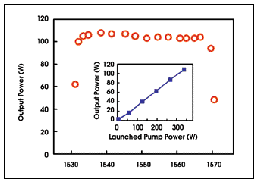 他们使激光器在1531到1571nm之间调谐,在1532- 1568nm波段,测出的输出功率超过100W(图3)。输出功率随泵浦功率线性变化,再一次表明进一步提高输出功率是可行的。
