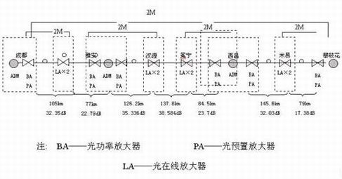 ·印江,松桃分别加光功率放大器(BA),实现130km长距离无中继传输