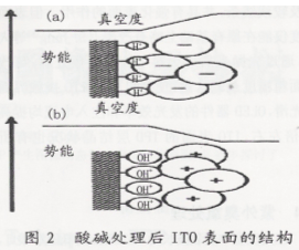 OLED是空穴注入限制器件,空穴注入的数目直接影响整个器件的性能。通过改变表面的In、O、Sn及表面C污染物的含量,可以提高表面功函数,减小空穴注入的势垒,提高空穴注入的数目。ITO是n型半导体,由重搀杂的Sn4+以及氧空位提供电子,当减少这两种成份在表面的含量时间,表面功函数就会降低。