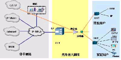 我们知道,当前以铜缆双绞线为基础的PSTN网络和xDSL宽带接入网络是固网运营商最重要的电信平台,这一电信平台主要用于满足用户话音和宽带数据业务需求。而目前,用户数据业务需求从最初的宽带Internet接入这一单一业务逐渐扩展到VoD、IPTV等多种业务,带宽要求也越来越高;而话音业务在逐渐萎缩,逐渐成为宽带业务的一个特性。为满足用户业务发展的需要,ADSL在向ADSL2+、VDSL2等更高速度接入方向迁移,而FTTH系统的引入,会将用户接入速度提升数倍甚至数十倍的,这必然加快电信网络IP化的进程。所以FTTH系统本身应该是一个基于IP/MPLS的平台,这样才能满足大带宽、丰富的增值业务的用户需求。华为公司的FTTH正是基于IP/MPLS平台开发的,其模型如图2所示。