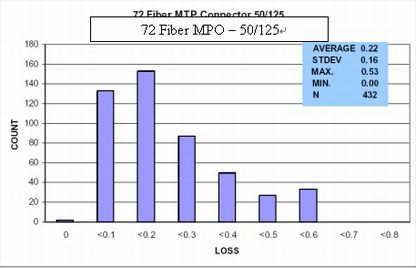 高光纤数的连接器的性能低于单光纤连接器。这在很大程度上是因为技术的成熟度;然而,统计数据也有关系。单光纤插针的检测可在任何偏离值时截取生产分布图,以限制插入损耗。而对于MT插针,所有光纤孔都要位于其理想位置的几微米范围内。孔的数量越多,最差的一个孔的公差越大。换句话说,如果一个插针由于超出公差而被废弃,71个合格孔也将废弃。因此,多光纤插针的典型插入损耗一般要高于单光纤连接器。