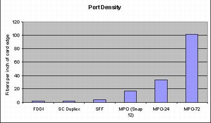 由于光纤的直径极小(即使在加上保护层后,直径也仅为250微米,大约是头发直径的4倍),因此,在体积相对较小的光缆中可以放入数百条光纤。然而,用连接器端接这些光纤会使占用空间增加20到50倍。尽管摩尔定律也适用于交换机和PHY芯片的通道数量,但连接器技术也需要努力适应这一定律。