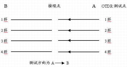 用OTDR监测光纤接续,常用的有两种方法,第一种是前向单程测试法,OTDR在光纤接续方向前一个接头点进行测试,采用这种方法监测,测试点与接续点始终只隔一盘光缆长度,测试接头衰耗较为准确,测试速度较快,大部分情况下能较为准确的取得光纤接续的损耗值,但缺点是所测得的损耗值全部是单向测试数据,还不能全面、精确地反映光纤接续的真正的损耗值。如图所示: