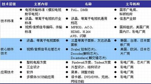 从平板电视的整体技术来说,应该分为三个层级,即技术标准(系统)、核心部件技术、整机应用技术。三个技术层级由不同类型的机构和厂商所主导,目前还很难找到可以完全通吃的厂商,所以找准自己的定位,形成独特的、差异化的技术竞争力是彩电厂商的主要课题。