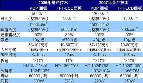表二:液晶、等离子电视面板主要技术参数