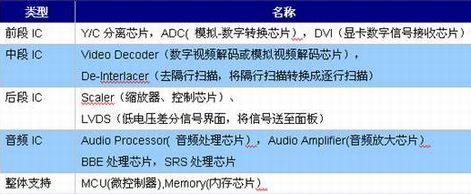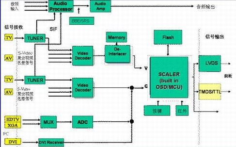 中段ICVideoDecoder(数字视频解码或模拟视频解码芯片),De-Interlacer(去隔行扫描,将隔行扫描转换成逐行扫描)后段ICScaler(缩放器、控制芯片)、LVDS(低电压差分信号界面,将信号送至面板)音频ICAudioProcessor(音频处理芯片),AudioAmplifier(音频放大芯片)BBE处理芯片,SRS处理芯片