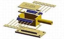 装配组装:针对较低数据传输速率及较短传输距离的应用而言,激光二极管及发光二极管通常封装在TO-盒中。激光二极管或发光二极管首先会粘着在子载具之上,再粘着在TO-盒底座上。在较低数据传输速率(例如100Mbps)时芯片粘着材料一般为银胶。在较高数据传输速率(例如1Gbps)时,则使用AuSn焊料以得到理想的散热处理。