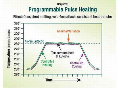 这种工艺控制的价值我们可以从激光二极管应用于激光光源或泵浦激光器当中得到体现,这是一个在组装过程中需要小心谨慎的工艺控制,对温度极端敏感的器件,在in-situ共晶裸芯粘接过程中,回焊工艺被工程化以提供一致的熔解且无孔洞的粘接接口,这将产生一致的热传导性,对激光器操作过程中保持温度稳定性有着显著的贡献。
