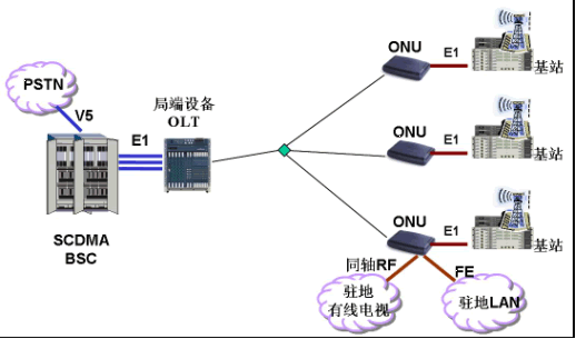 对于移动运营商而言,开展村村通工程更多的是考虑如何将GSM/CDMA这些全国性的网络延伸到农村。在这些网络中,通常,移动通信的基站和基站控制器之间的传输链路是E1,E1通常需要靠传统的光纤通信系统和数字微波系统,也可以用GPON/EPON系统来代替。其相关的组网方案与SCDMA类似。