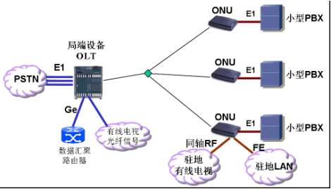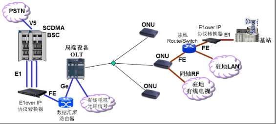 若采用GPON技术,一般可以直接利用GPON设备提供的E1端口,为SCDMA的BSC及BSS之间提供E1的传输,此外ONU还可以通过FE端口为驻地提供以太网业务,通过同轴有线电视口为驻地提供模拟有线电视节目信号。如图1所示。