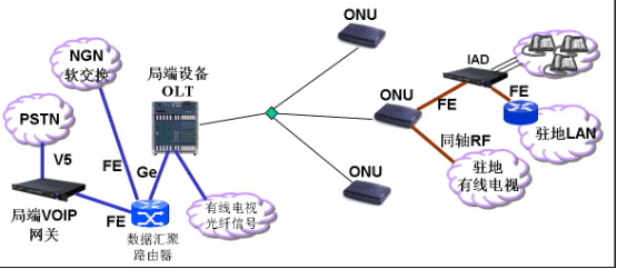 PON光纤接入技术,其在光分支点不需要节点设备,只需安装一个简单的光分支器即可,因此具有节省光缆资源、带宽资源共享、节省机房投资、设备安全性高、建网速度快、综合建网成本低等优点。采用PON技术还能实现三网合一的业务。