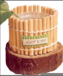 4、竹筷上下两端均以同样方法缠绕,直到足够围绕塑胶皿外围的长度为止,便可将它粘贴固定,最后可再加上一圆形木块做底座,增加美感。